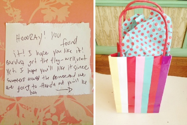 "Hooray! You found it! I hope you like it! Couldn't get the flag- well not yet. I hope you'll like it since summer's around the corner and we are going to Florida and you'll be hot."